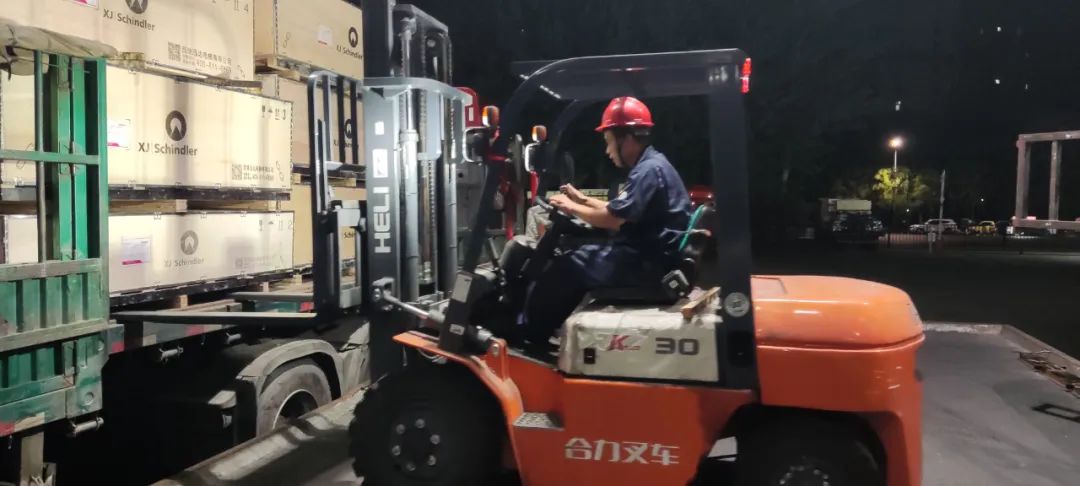 深夜,滿載貨物的車輛蓄勢待發,正在做發貨前的各項準備工作,力爭以最快的速度把電梯設備運送至安裝現場。