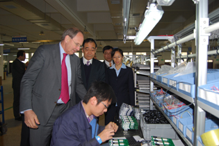 日前,瑞士迅達集團副董事長Mr.Luc Bonnard(上圖左),總裁Mr.Tinggren(上圖右)先后蒞臨公司,在公司董事長劉金忠、總經理劉剛、常務副總經理李國鈞、副總經理陳衛東的陪同下,對公司各個廠區的生產情況、銷售狀況、項目安裝運行情況等等,進行了詳細查看和了解,并對公司整體生產經營情況給予了較高評價。圖為公司領導陪同Mr.Luc Bonnard和Mr.Tinggren在車間視察。