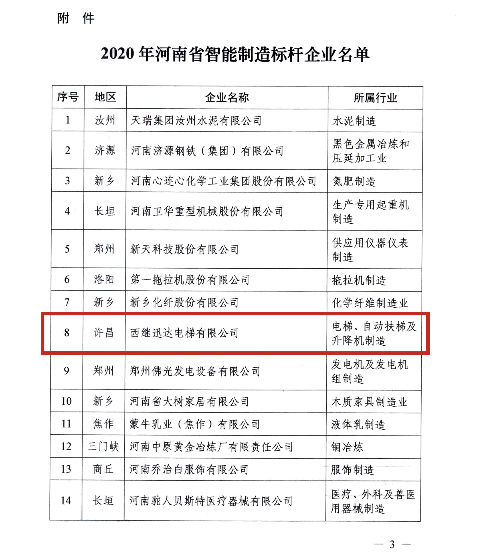 2月1日,西繼迅達電梯被河南省工業和信息化廳認定為河南省智能制造標桿企業。