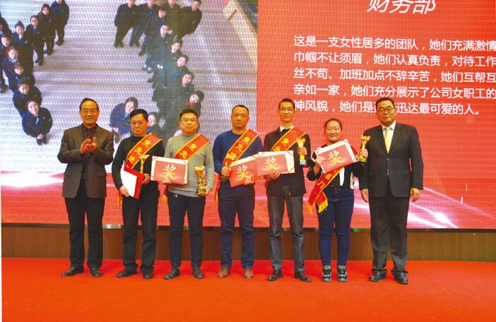 隨后,公司副總經(jīng)理、工會主席陳衛(wèi)東宣讀了《關(guān)于表彰2018年度工會工作先進(jìn)部門和先進(jìn)個人的決定》,為表彰先進(jìn),弘揚正氣,公司對于2018年度涌現(xiàn)出來的5個先進(jìn)部門、32名首席員工、8名巾幗標(biāo)兵予以通報表彰。頒獎典禮上,在歡樂激昂的的樂曲聲中,劉董事長和劉總經(jīng)理親自為先進(jìn)部門、首席員工和巾幗標(biāo)兵頒發(fā)榮譽證書、獎杯、獎金或獎品,并興致勃勃地與先進(jìn)部門、首席員工、巾幗標(biāo)兵合影留念。