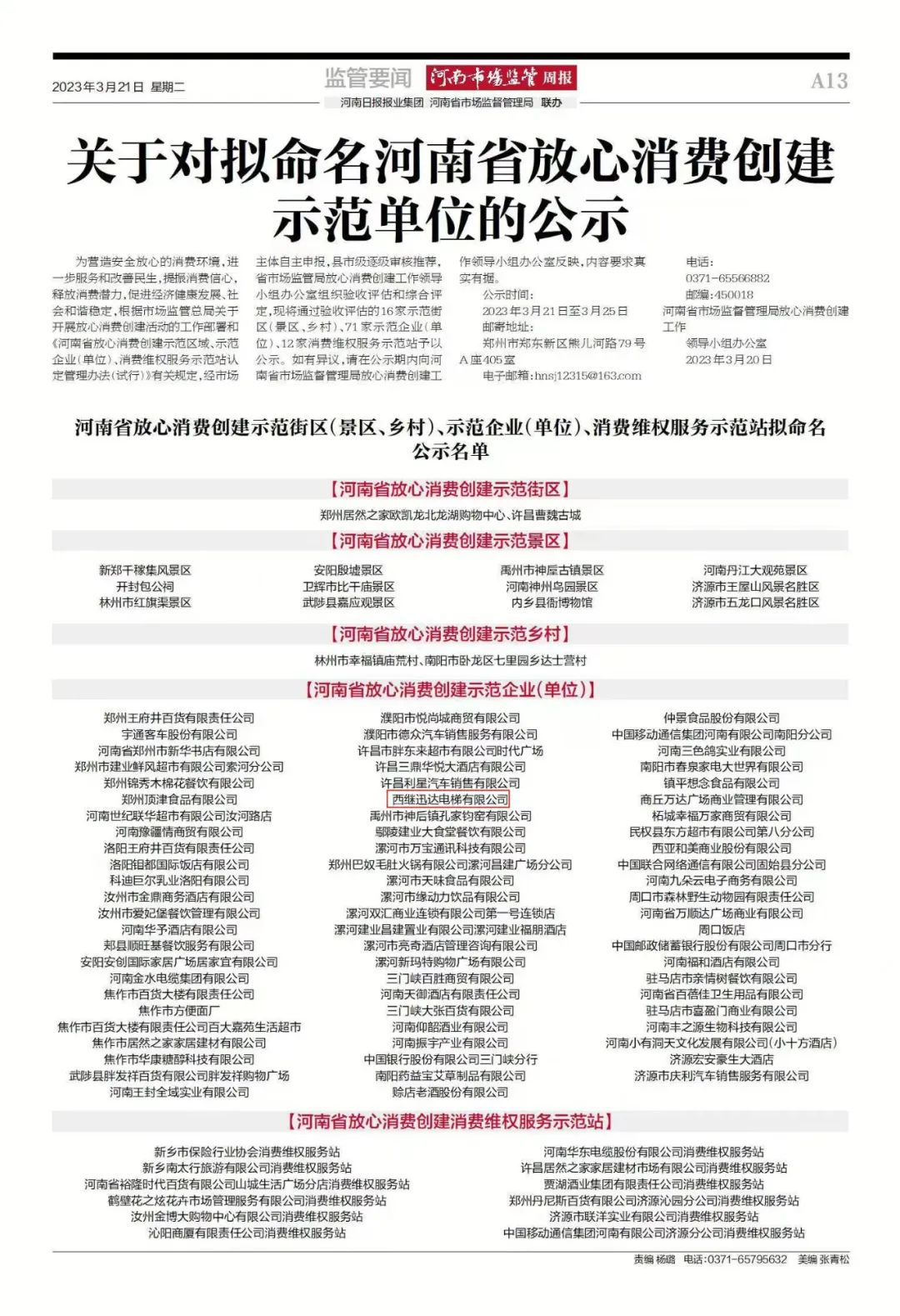 西繼迅達被評為河南省放心消費創建示范企業