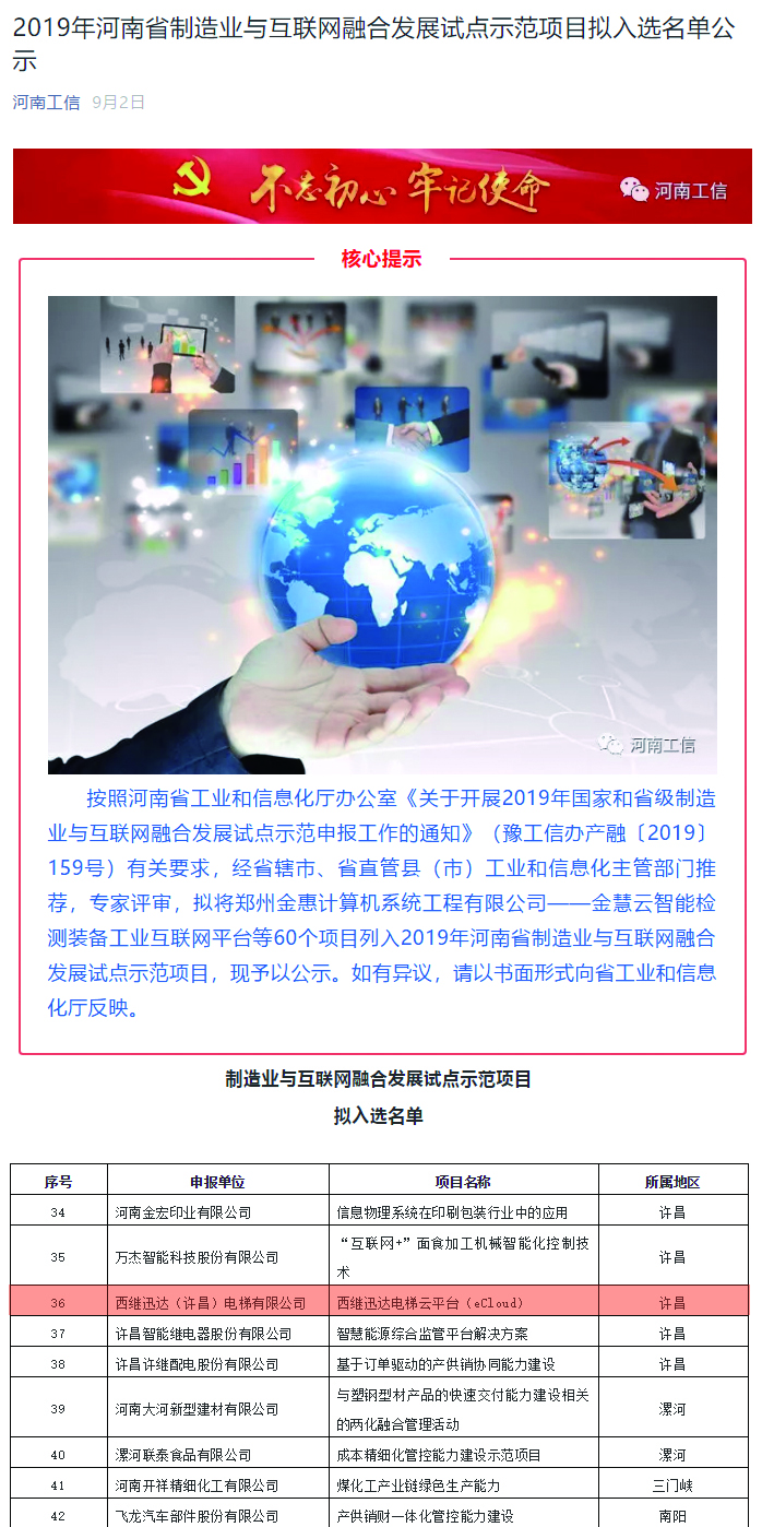 西繼迅達eCloud電梯云平臺入選省制造業與互聯網融合發展試點示范項目